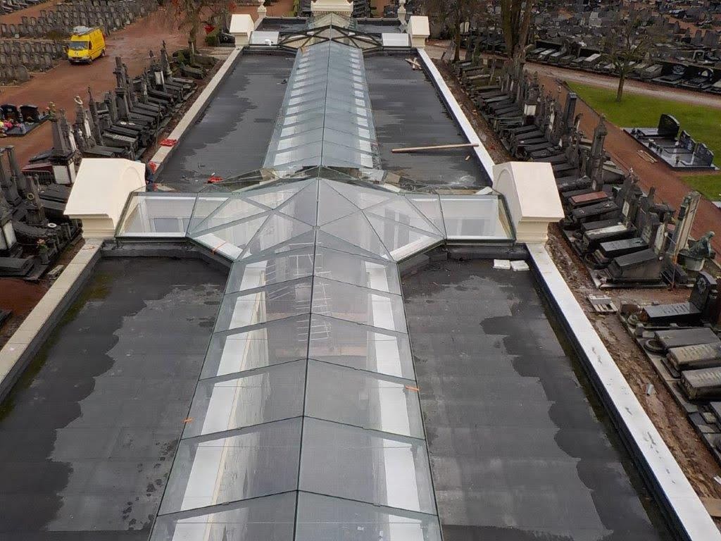 In opdracht van aannemer Denys realiseerden wij de staal- en beglazingswerken voor de grafgalerijen in Sint-Jans-Molenbeek. Het project omvatte een indrukwekkende overkoepeling met een 100 meter lange lichtstraat en twee diamantvormige koepels boven de achtzijdige paviljoenen.